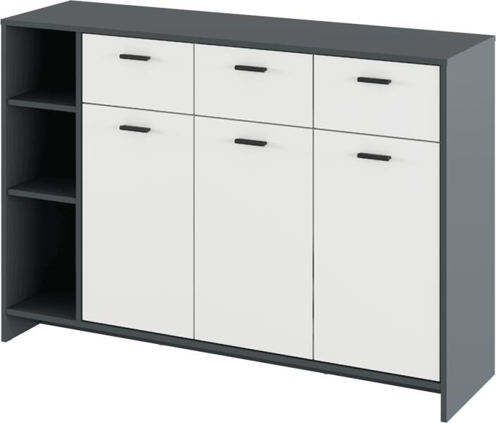 Komód NEPOLA TYP 2 Anyag: laminált faforgácslap Kivitelezés: grafit/fehér Méretek (SzéxMéxMa): 135x38x92 cm Fiók méretei (SzéxMéxMa): 33,6x33,2x19,2 cm Szekrények ajtainak mérete (SzxMa): 35x60,4 cm Polc méretei a kétajtós szekrényben (SzxMé): 70x35,8 cm Polc méretei az egyajtós szekrényben (SzxMé): 34,6x35,8 cm Polc méretei a polcrendszerben (SzxMé): 23,2x37,5 cm Polcok t