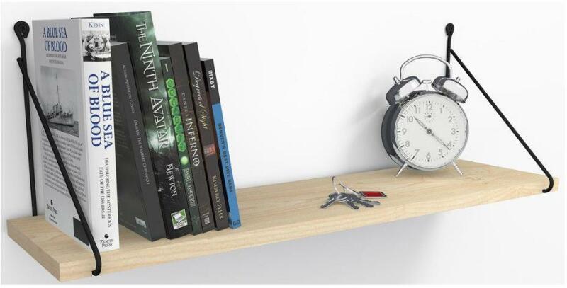 Laminált bútorlapból készült fekete színű polc-szett 60 cm x 20 cm, két darab fekete hajlított, átlós fém konzollal.