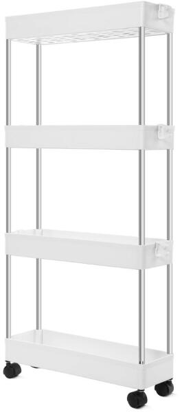 4 szintes kerekes tároló polc. A peremmel ellátott polcok 4 függőleges acél rúddal kapcsolódnak, a 40 x 13 cm-es polcfelület rendkívül helytakarkos, ennek ellenére rengeteg kisebb használati tárgynak tud helyet biztosítani. A megmelt polcperemek megakadályozzák a tárgyak leesését. A konyhai felhasználás mellett praktikus megoldás iróasztalok mellé vagy fürdőszobában. F