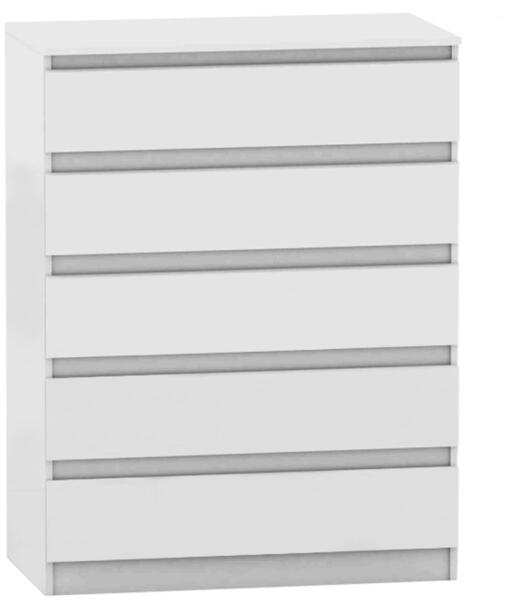5 fiókos komód HANY NEW 005 Anyag: laminált DTD Színe: fehér Méretek (SzéxMéxMa): 90x49x117,3 cm ABS élek Minőségi szlovák termék. Szállítás szétszerelve.
