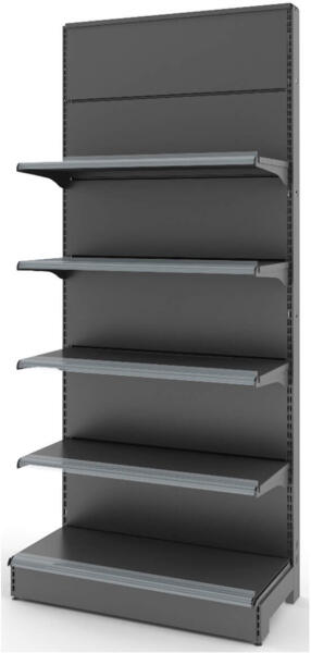 Műszaki adatok: - Minőségi egyoldalas üzleti polcrendszer - Könnyen, csavarozás nélkül összeállítható - Minőségi kidolgozás, minőségi festés - Matt fekete szín - Mérete: 2000mm (magasság) x 1200mm (szélesség) x 400mm (mélység) - 5 db polccal (1 db 1200 x 400mm, 4db 1200 x 350mm) - Alkatrészek: 2 db láb, 10 db tartósín, 5 db hátlap, 4+1 db polc, alsó polc előlap - Op