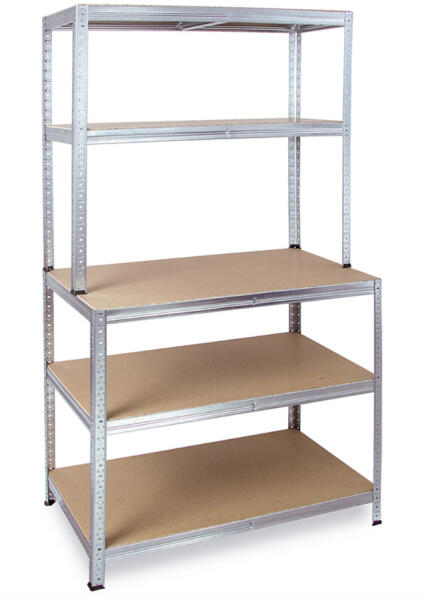 180 x 100 x 60/30 cm méretű horganyzott acélvázból álló tároló polc, 5 polccal. Kombinált polcrendszer, az alsó részen 60 cm mély, felül 30 cm mély polcokkal. A középső polc kiváló munkafelületet biztosít. Csavarozás nélkül, egymásba illeszthető elemekből összeállítható, ahol a polcokat tetszőleges magasságban helyezhetjük el. Ideális tároló polc garázsokban,