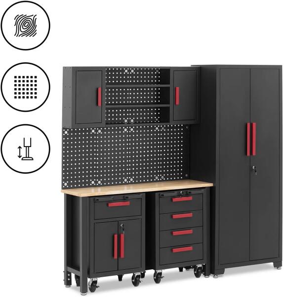 Az MSW zárható zárható szerszámos szekrénye nagy tárolófelületet, perforált falat, 4 tágas fiókot és különböző méretű szekrényeket kínál bármilyen eszköz tárolására, amire a projektjéhez szüksége van. A szekrény és a mobil tárolók mindegyike kulccsal zárható, így szerszámai mindig biztonságban vannak. A fémből és fából készült szerszámos szekrény ell