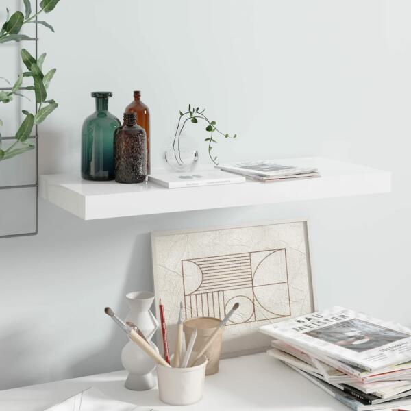 vidaXL magasfényű fehér MDF lebegő fali polc 60 x 23,5 x 3,8 cm Ez a stílusos fali polc az otthona fókuszpontja lesz. A láthatatlan rögzítőrendszernek köszönhetően ez a fali polc könnyen felszerelhető, és tökéletes hely különböző tárgyak, például díjak, könyvek, gyűjtemények, dísztárgyak stb. elhelyezésére. Ez az állvány minőségi méhsejt szerkezetű MDF-ből k
