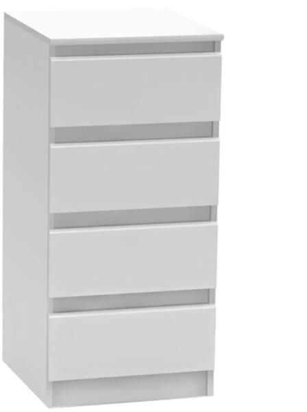 4 fiókos komód HANY NEW 009 Anyag: laminált DTD Színe: fehér Méretek (SzéxMéxMa): 45,2x49x95,4 cm Minőségi szlovák termék. ABS élek Szállítás szétszerelve.