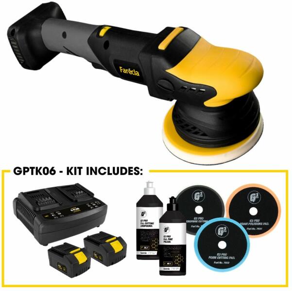 Farécla G Plus Rotary akkumulátoros polírozógép polírozógép 2 elemmel, iker töltővel. GPTK01/ 66254431181 készlet tartalma: G Plus akkus Rotary polírozógép | GPT050/ 78072773698 [x1] G Mop rugalmas hátlap 150 mm-es / 6″ alátétekhez (14 mm-es menet) | GMB146/78072700148 [x1] G Plus újratölthető Li-Ion akkumulátor | GPT150/ 78072773702 [x2] G Plus 18V Twin Bay akkumulát