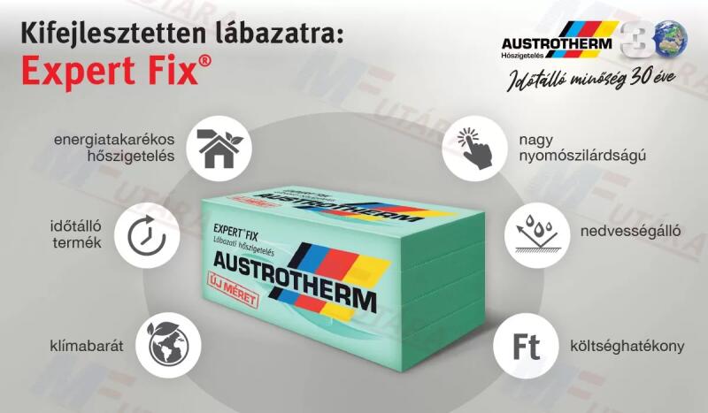 Új méret! 1000x500 mm Az AUSTROTHERM EXPERT® FIX nagy szilárdságú formahabosított expandált polisztirol hőszigetelő lemez. A fokozott felületi bordázottság miatt jól tapad rá a vakolat, és a betonnal is szilárd kötést ad, így a hőhidak szigetelésére különösen alkalmas. Homlokzati hőszigetelő rendszerekben a lábazati és a fogadószinti felületeken jól alkalmazható,