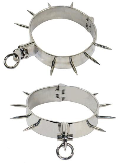 Tüskés acél nyakörv. Rozsdamentes acélból-felpolírozva. Imbusz kulccsal nyitható-zárható. A tüskék hossza:5cm. Szélessége:4cm. Belső átmérő:13,5cm.