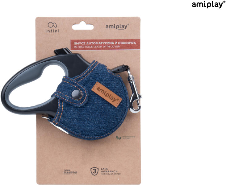 Denim L automata 5m zsinóros póráz közepes fajtájú kutyáknak 25 kg-ig. A legjobb minőségű anyagokból készült, strapabíró, praktikus, egy kézzel is kezelhető. Borításának anyaga eredeti 100% pamut farmer. Szabadon cserélhető az Amiplay széles választékával, ami lehetővé teszi, hogy a pórázt bármilyen stílushoz illessze. A zsinór teljes hossza 5 m, ami megkönnyíti
