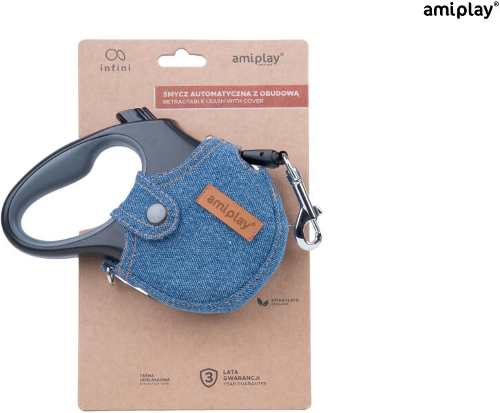 Denim M automata 5m zsinóros póráz közepes fajtájú kutyáknak 15 kg-ig. A legjobb minőségű anyagokból készült, strapabíró, praktikus, egy kézzel is kezelhető. Borításának anyaga eredeti 100% pamut farmer. Szabadon cserélhető az Amiplay széles választékával, ami lehetővé teszi, hogy a pórázt bármilyen stílushoz illessze. A zsinór teljes hossza 5 m, ami megkönnyíti
