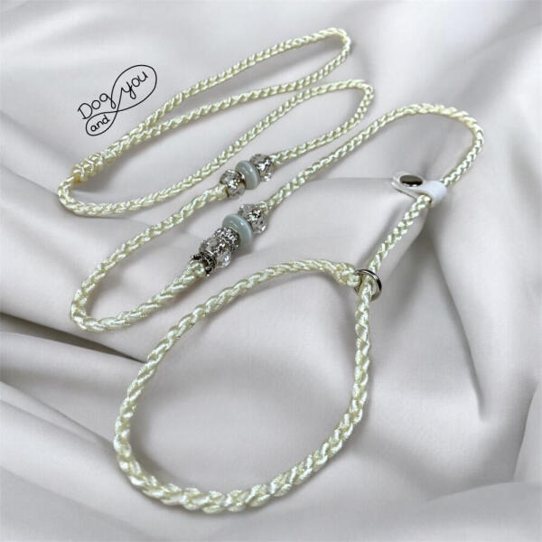 Az elegáns, fonott, ekrü színű gyöngyös felvezető póráz, retriver típusú tökéletes választás bármilyen fajtájú kutya felvezetésére. Teljes hossza: 130 cm. Könnyű és mutatós. Biothane stoppos. Ha szeretnél a pórázon változtatni, vedd fel velünk a kapcsolatot! Igény szerint készítünk más hosszaban, színben, kivitelben.