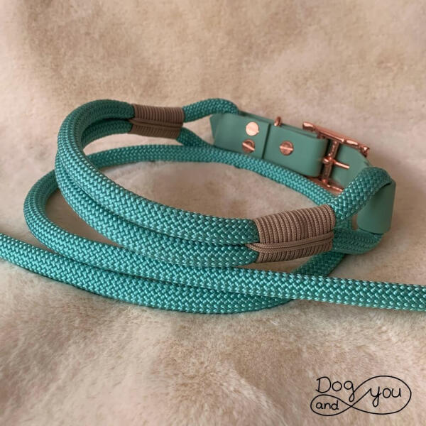 Az üde kötél szett egy 10 mm vastag hosszú pórázból és egy 10 mm vastag állítható kötél nyakörvből áll. A kötél sea green színű. Közepes és nagytestű kutyáknak ajánljuk a nyakörvet. Az állítási lehetőséget sea green színű Biothane-nel oldottuk meg, mely erős és praktikus eleme a nyakörvnek. A dísz elkötés színe: homok A fémszerelék színe: rosegold A pór