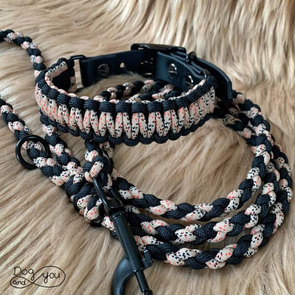 Az elegáns Burberry mintára hajazó szett mintás homok és fekete színű paracordból tevődik össze. Igazán meleg színeknek köszönhetően ez a szett az ősz nagy kedvence lett! A szett egy 2 cm széles, fonott Szimpla nyakörvből és egy könnyű paracord pórázból áll. A nyakörv állíthatóságát fekete Biothane-nel oldottuk meg, a póráz könnyű és mutatós. A fémszerelék t