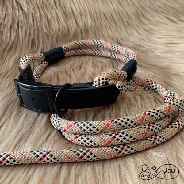 Az elegáns kötél szett egy 10 mm vastag hosszú pórázból és egy 10 mm vastag állítható kötél nyakörvből áll. A kötél mintázata a közkedvelt burberry mintázatra hajaz. Közepes és nagytestű kutyáknak ajánljuk a nyakörvet. A díszelkötés: fekete Fémkelllék színe: fekete Az állítási lehetőséget fekete Biothane-nel oldottuk meg, mely erős és praktikus eleme a nyak