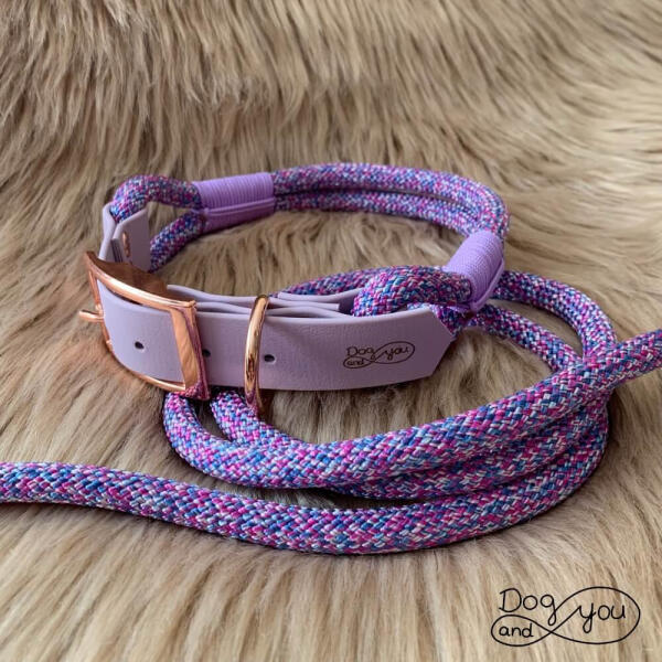 Az csajos és üde kötél szett egy 10 mm vastag hosszú pórázból és egy 10 mm vastag állítható kötél nyakörvből áll. A kötél lila mintás, kellemes tavaszi színű. Közepes és nagytestű kutyáknak ajánljuk a nyakörvet. Az állítási lehetőséget pasztell lila Biothane-nel oldottuk meg, mely erős és praktikus eleme a nyakörvnek. A dísz elkötés színe: pasztell lila A f