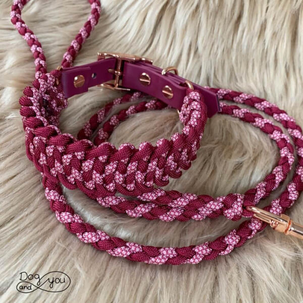 A csajos szett burgundi vörös és vörös és rózsaszín dimond paracord egyvelegéből tevődik össze. A hercegnős szett egy 3,5 cm széles, fonott Duci nyakörvből és egy könnyű paracord pórázból áll. A nyakörv állíthatóságát borvörös Biothane-nel oldottuk meg, a póráz könnyű és elegáns kivitelezésű. A fémszerelék típusa: rosegold A kép csak illusztráció! A sze