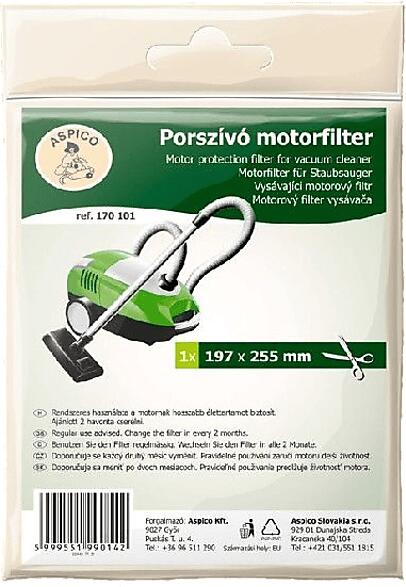 Poliészter anyagból készült, nagy légáteresztő képességgel. A motorfiltert a porszívó motorja elé helyezze, hogy védje annak működését és hosszabbítsa élettartamát. Megszűri a beáramló levegőből a legkisebb részecskéket, mint például a baktérium, pollen vagy poratka. A porzsák esetleges elszakadása vagy felrobbanása esetén 'katasztrófa filterként' viselkedik, m
