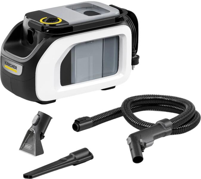 Szőnyeg- és kárpittisztító SE 3 CompactA nagy teljesítményű és energiatakarékos SE 3 Compact kárpittisztító lenyűgöz a textilfelületek, például kárpitok szálakig hatoló tisztításával, kompakt kialakításával és a saját magát tisztán tartó rendszertisztító funkciójával. Mélytisztítás a szövetszálakig és kompakt kialakítás: az SE 3 Compact kárpittisztító