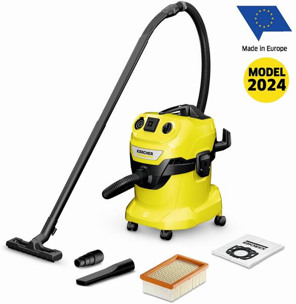 Szupererős és energiatakarékos nedves/száraz porszívó 20 l-es műanyag tartállyal, hálózati csatlakozóval az elektromos szerszámokkal való munkavégzéshez, 5 m kábellel, 2,2 m szívótömlővel és fúvófunkcióval. Szupererős és energiatakarékos 1000 W-os teljesítmény: A WD 4 P V-20/5/22 nedves/száraz porszívó készüléke, szívótömlője és csíptetős padlófúvókája