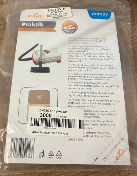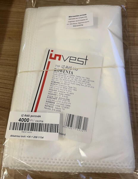 Rowenta kompatibilis. A porzsák egyszer használatos, így amikor megtelik vagy azt a készülék telítettségjelzője jelzi, akkor ki kell dobni! Ne szívjon fel a porszívóval folyadékot, mert a porzsák anyaga miatt az meggyengülhet és kiszakadhat, kárt téve így a készülékben. A porzsák mögött lévő motorvédő szűrő állapotát rendszeresen ellenőrizze , szükség esetén cs