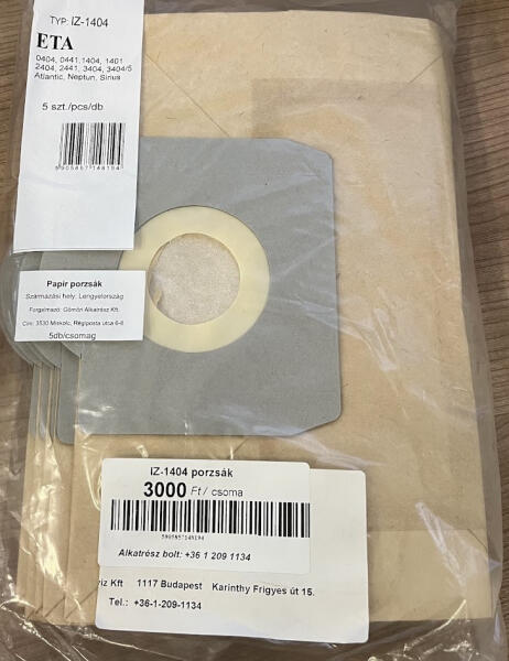 ETA takarítógép 1441, 2404, 3404 modellekhez kompatibilis. A porzsák egyszer használatos, így amikor megtelik vagy azt a készülék telítettségjelzője jelzi, akkor ki kell dobni! Ne szívjon fel a porszívóval folyadékot , mert a porzsák anyaga miatt az meggyengülhet és kiszakadhat, kárt téve így a készülékben. A porzsák mögött lévő motorvédő szűrő állapotát rendsze