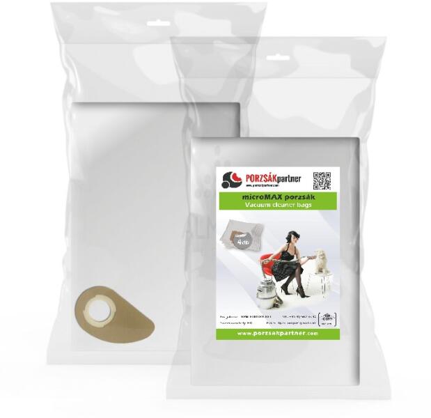 Méretek: Lyuk átmérő: 39mm. Lyuk távolság: 35mm. Magasság: 130mm. Szélesség: 90mm. Zsák hosszúság: 120mm. Zsák magasság: 160mm. Zsák szélesség: 125mm. Csomag tartalma: 4 db porzsák.