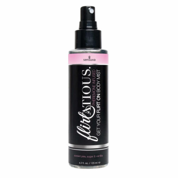 Sensuva Flirtatious - feromonos testpermet -125ml. Érzékien édes vaníliás és csodás virágillat (sweet pea) keverékéből készülő testpermet, mely feromon és növényi afrodiziákum tartalmának köszönhetően vágyra gerjeszti, elvarázsolja partnered! A szobát is befújhatod vele! Összetevők: Water, Hamamelis Virginiana (Witch Hazel) Extract, SD Alcohol 40b, Lepidium Mayenii (Mac