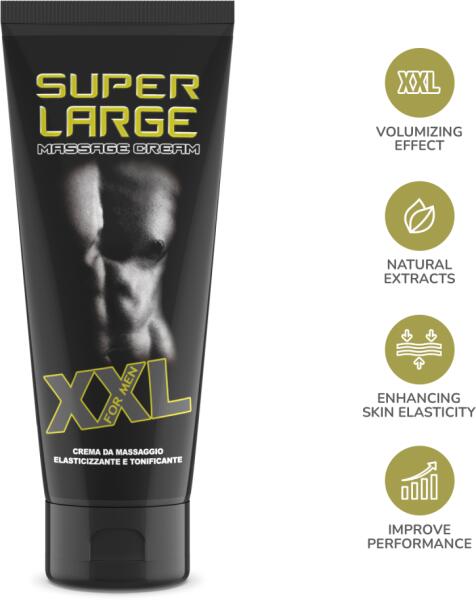 A Super Large egy térfogatnövelő krém a pénisz számára. Rendszeresen alkalmazva segíthet növelni a hímvessző térfogatát. Teljesen természetes termék, kombinálja a masszázs során az ujjak által kifejtett hatást a dermotenzor hatású hatóanyagokkal. A Super Large forradalmian új formulájának köszönhetően élénkíti a péniszt, és már az első alkalmazás után növeli