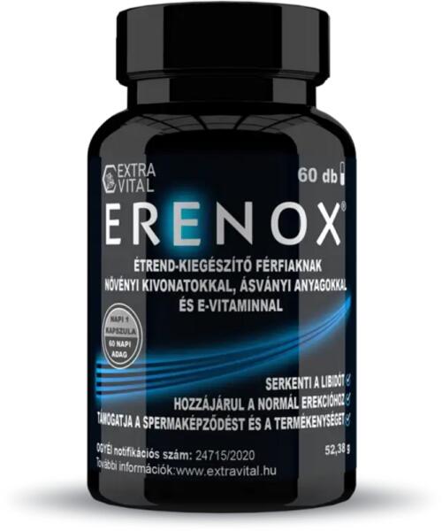 ERENOX férfiaknak kapszula egy innovatív és komplex hatású étrend-kiegészítő Kifejezetten a férfiak szexuális egészségének és teljesítményének támogatására lett kifejlesztve. Természetes növényi kivonatok, ásványi anyagok és E-vitamin ideális kombinációját tartalmazza, amelyek egymás hatását kiegészítve járulnak hozzá a normál és fokozott szexuális teljesí