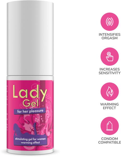 A Lady Gel egy stimuláló gél a csikló és a hüvely számára, amelyet a női szexuális élvezet fokozására és a magánrészek érzékenységének javítására fejlesztettek ki. Úgy fejti ki hatását, hogy serkenti a véráramlást a csikló és a hüvely területén. A csiklóra és a hüvelyre történő felvitel után enyhén csiklandozó hőérzetet kelt, növeli érzékenységét
