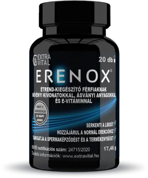 ERENOX férfiaknak kapszula egy innovatív és komplex hatású étrend-kiegészítő Kifejezetten a férfiak szexuális egészségének és teljesítményének támogatására lett kifejlesztve. Természetes növényi kivonatok, ásványi anyagok és E-vitamin ideális kombinációját tartalmazza, amelyek egymás hatását kiegészítve járulnak hozzá a normál és fokozott szexuális teljesí