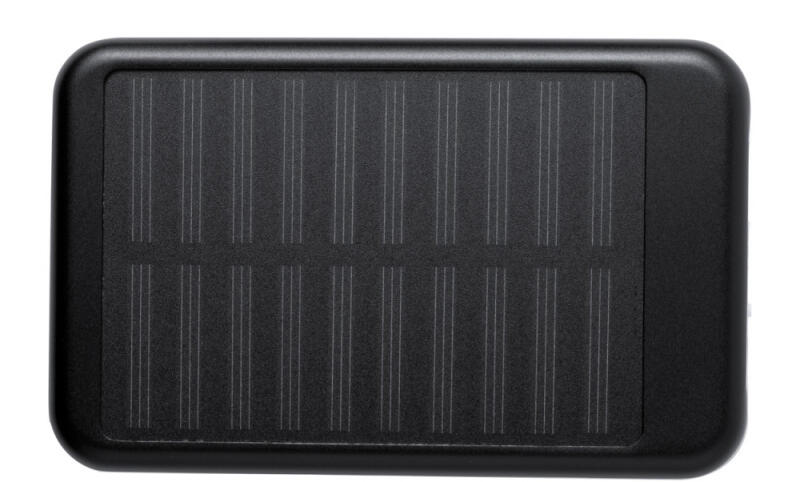 Alumínium USB power bank 4000 mAh akkumulátorral és beépített napelemes töltővel. A termék micro USB töltőkábelt tartalmaz.