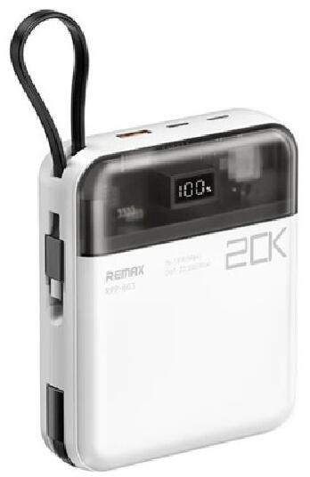 Remax Sucha Pro RPP-603 gyorstöltő Powerbank 20000mAh - Fehér Termékszín: Fehér Ultrakompakt méret Beépített Lightning és USB-C kábelek Töltöttséget kijelző LCD Könnyű súly Valódi gyorstöltés