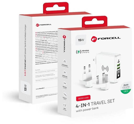 Információk Forcell 4in1 univerzális töltő, külső akkumulátor / power bank vezeték nélküli töltéssel, USB/USB-C, (15W/8000mAh) fehér