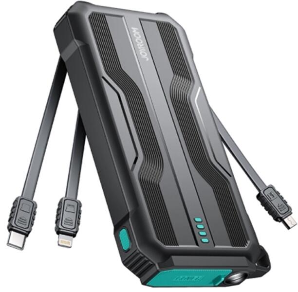 Joyroom L016 - fekete power bank 10000mAh, beépített MicroUSB/Type-C/Lightning/USB kábelekkel. A Powerbank ideális kiegészítő a mindennapi használatra és az utazáshoz. Ez a hordozható tápegység beépített Type-C (USB-C), MicroUSB és Lightning kábelekkel érkezik, így többé nem kell plusz kábeleket cipelnie. Az 10000mAh kapacitás elegendő a legszükségesebb eszközök feltöl