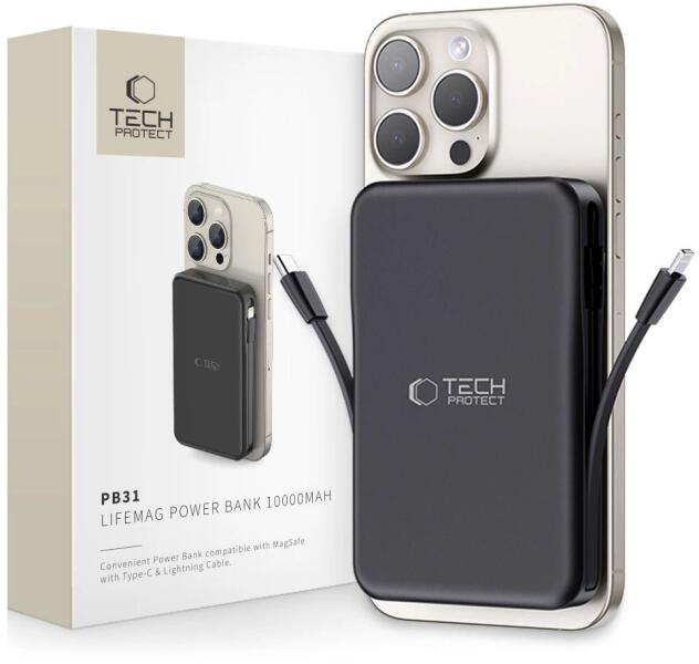 A Tech-Protect PB31 LifeMag egy könnyű és kompakt powerbank, amely kompatibilis a Magsafe technológiával, és amelyet fejlett funkcionalitás és modern design jellemzi. A 10000mAh kapacitás elegendő energiát nyújt ahhoz, hogy többször is feltöltse mobil eszközeit, bárhol is legyen. A két bemenetnek köszönhetően: 1 x USB-C és 1 x USB-A, különböző eszközöket tölthet egyide