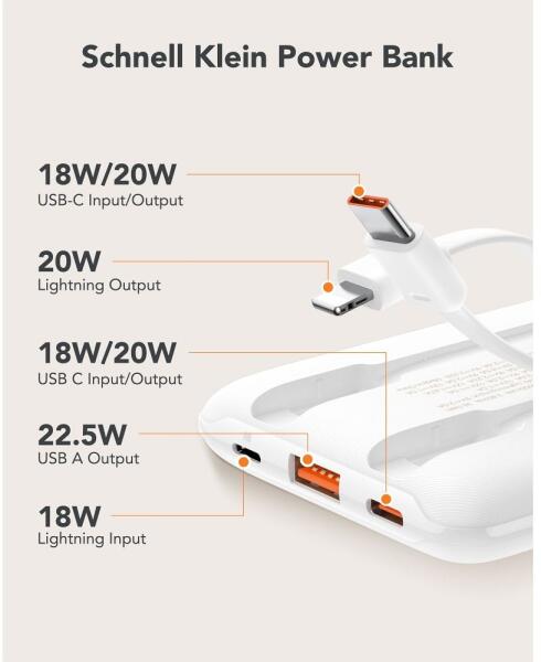 A 10 000mAh kapacitású Veger C11 power bank garantálja a gyors töltést bárhol és bármikor. Hordozható töltő beépített kábelekkel Power bank 10,000mAh portokkal: kimenet USB-A 22.5W) és két bemenet (USB-C 18W, Lightning 18W) és 2 beépített kábel (kimenet Lightning 20W és bemenet/kimenet USB-C 18W/20W) alkalmas a piacon lévő legtöbb legújabb eszközzel való közvetlen haszn