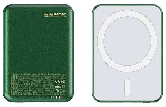 Remax Fantasy RPP-509 MagSafe Powerbank 5000mAh 20W Termékszín: Zöld MagSafe technológia Könnyű és kompakt Túláram- és rövidzárvédelem Töltöttségjelző LED-ek Felragasztható mágneskarika