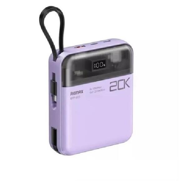Remax Sucha Pro RPP-603 gyorstöltő Powerbank 20000mAh - Lila Termékszín: lila Kompakt és hordozható LED kijelző a töltöttségi szintről Gyors töltési lehetőség Beépített kábelek Könnyű súly