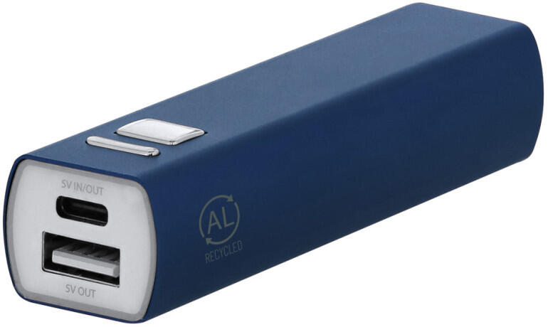 Újrahasznosított alumínium power bank 2600 mAh akkumulátorral. 1 USB és 1 USB-C töltőporttal. USB-C bemeneti porttal. USB töltőkábellel szállítjuk.