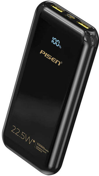 Pisen BL-D68LS, 10000mAh kapacitású, 22,5W teljesíményű powerbank, gyorstöltési protokoll támogatással, 3 készülék egyidejű töltési lehetőségével. Beépített LED kijelzővel rendelkezik, amely lehetővé teszi, hogy kényelmesen ellenőrizze töltöttségi szintjét. A powerbank támogatja a legnépszerűbb gyorstöltési szabványokat, köztük a PD3.0 és a QC3.0 szabványokat