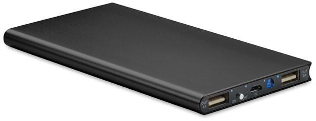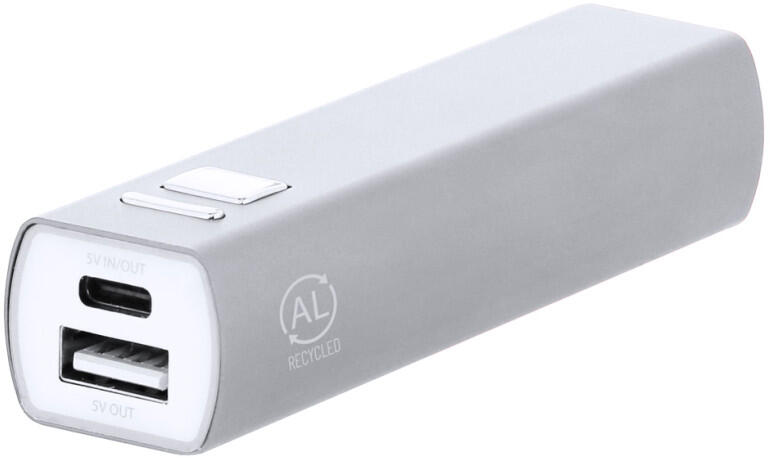 Újrahasznosított alumínium power bank 2600 mAh akkumulátorral. 1 USB és 1 USB-C töltőporttal. USB-C bemeneti porttal. USB töltőkábellel szállítjuk.