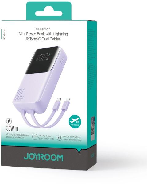 Joyroom powerbank 30W 10000mAh beépített Lightning és USB-C kábelekkel, lila (JR-PBC06) Fedezz fel egy forradalmi mobil energiaforrást - a Joyroom 30W teljesítményű, 10,000mAh kapacitású powerbankot. Ne köss kompromisszumokat, ne ismerj határokat - ez a tökéletes megoldás mindenkinek, aki a megbízhatóságot és a gyorsaságot egy kompakt eszközben értékeli. Fő előnyök: - 30W