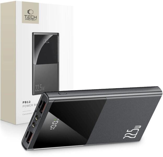 A PB12-22.5W, 10000mAh kapacitással, egy kompakt powerbank, amelyet a neves Tech-Protect márka alkotott. Teljesítménye 22,5W, amely lehetővé teszi, hogy egyszerre több eszközt is gyorsan feltölts. Az eszköz különféle gyors töltési protokollokat támogat, beleértve a PD3.0, QC3.0, AFC, FCP és SCP protokollokat, aminek köszönhetően sok eszközzel kompatibilis. Négy porttal van f