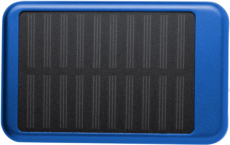 Alumínium USB power bank 4000 mAh akkumulátorral és beépített napelemes töltővel. A termék micro USB töltőkábelt tartalmaz.