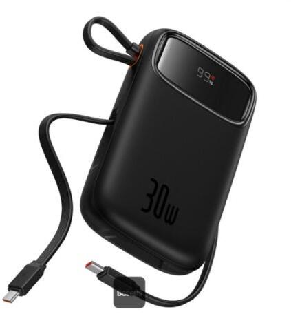 Baseus QPow2 10000 mAh digitális kijelző, gyorstöltés, 30 W-os akkumulátor, beépített kettős C típusú kábellel - fekete * 10000 mAh kapacitás több eszköz töltéséhez * 30 W-os gyorstöltés PD3.0 és QC3.0 támogatással * Digitális LED akkumulátor kijelző a teljesítményszint figyeléséhez * Több eszköz töltése: egyszerre 3 eszközt tölthet az USB-C és USB-A portokon ke