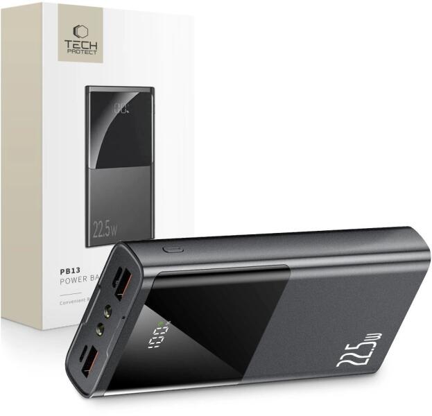 A PB13-22.5W, amelynek kapacitása 20000mAh, egy funkcionális powerbank, amelyet a neves Tech-Protect márka hozott létre. Teljesítménye 22.5W, ami lehetővé teszi több eszköz egyidejű gyors töltését. Az eszköz számos gyorstöltési protokollt támogat, beleértve a PD3.0, QC3.0, AFC, FCP és SCP protokollokat, ami számos készülékkel kompatibilissé teszi. Négy porttal rendelkezi
