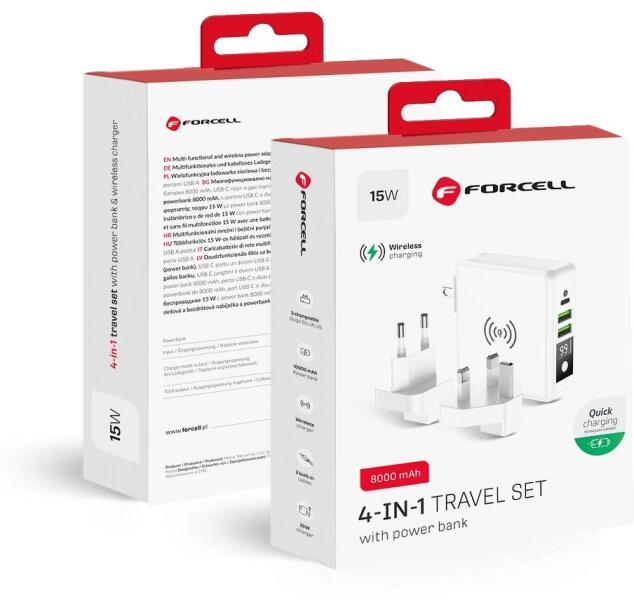 A tökéletes utazási készlet: FORCELL 4in1 multitöltő. Beépített portokkal: USB, USB-C, és egy power bankkal felszerelve. Lehetővé teszi az induktív töltést. Beépített portok: 2x USB és USB C, lehetővé teszik több különböző eszköz egyidejű töltését. 3 cserélhető csatlakozó: UK, US, EU, szinte bárhol a világon lehetővé teszik a különféle áramforrások használ