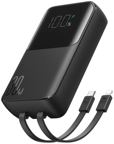 Joyroom JR-PBC06, mini külső akkumulátor 10000 mAh kapacitással és akár 30W teljesítménnyel, beépített USB-C és Lightning kábelekkel. A Power Delivery-nek köszönhetően azonnali töltést biztosít, a beépített USB-C és Lightning kábelek pedig lehetővé teszik az iPhone és Android telefonok egyszerű csatlakoztatását. A négy kimenet lehetővé teszi akár négy eszköz egyid