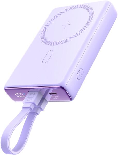Joyroom JR-PBM01 mágneses power bank 10,000 mAh kapacitással és 20W teljesítményig, állvánnyal + Lightning - USB-C kábel - lila A Joyroom JR-PBM01 mágneses power bank garantálja, hogy telefonod vagy vezeték nélküli fejhallgatód akkor is feltöltve maradjon, amikor a legnagyobb szükséged van rá. A Power Delivery technológiát támogató 20 W maximális kimeneti teljesítményével